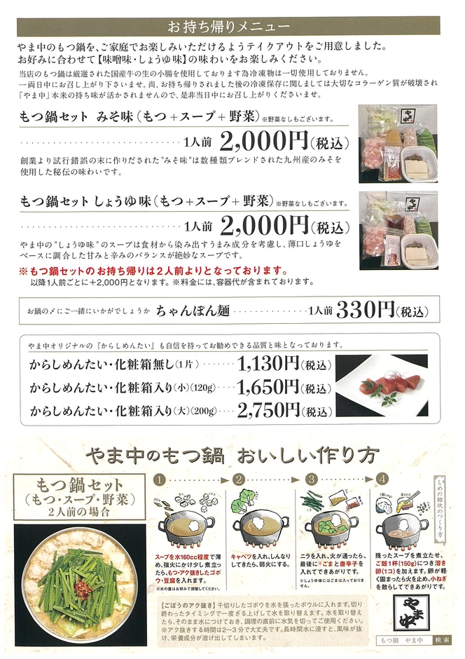 福岡の老舗、博多もつ鍋やま中の絶品もつ鍋をご自宅でいかがでしょうか。