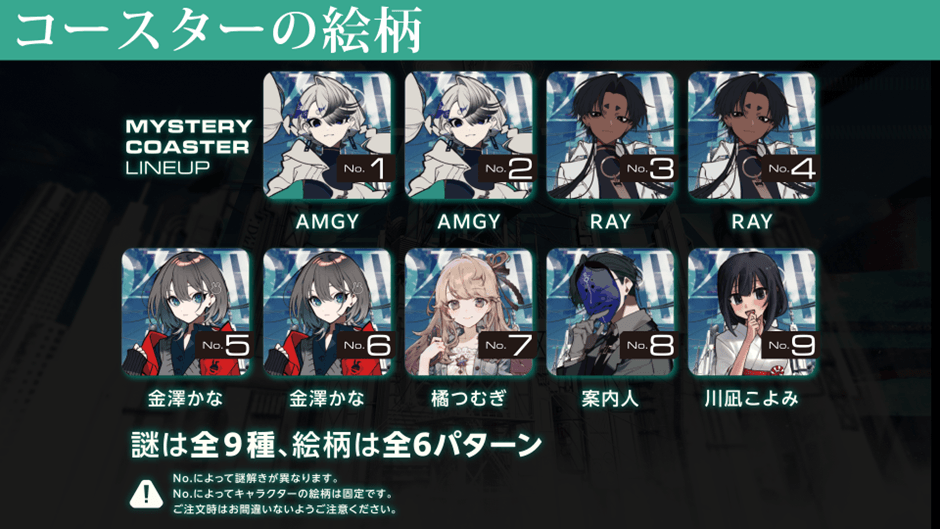 ※「謎解きコースター」は、コラボレーションドリンク1点につきお好きな種類を1枚プレゼントさせていただくほか、1,800円(税込)にてコースター9枚セットの販売も実施いたします。