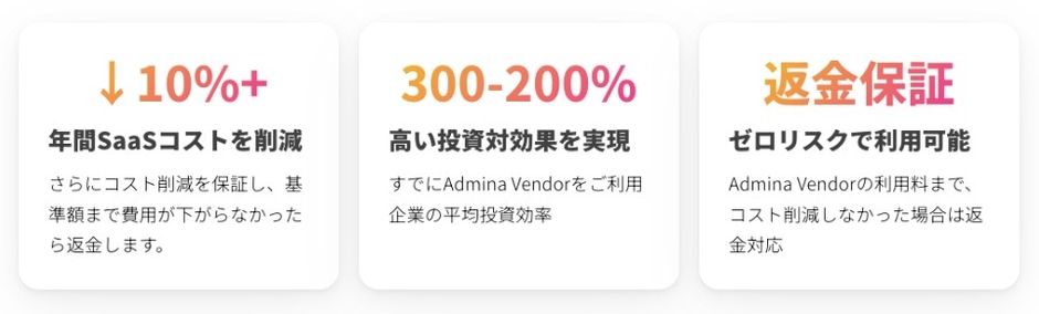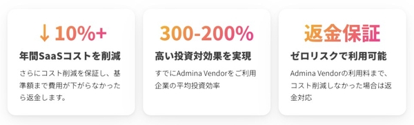 ※1 「Admina Vendor」プランの利用料をお申込時にお支払いいただきますが、事前に合意したSaaS利用料の削減目標まで削減額が達しなかった場合、未達分の金額を返金します。