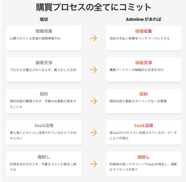 「Admina Vendor」プランは、ユーザー企業に適切なSaaS契約・購買プランを提案し、コスト削減を実現するサービスです。SaaSの購買におけるフローを一元化することで、事業部主導で使用したいSaaSを導入できる環境を担保しながら、より効率的なSaaS契約・購入を促します。