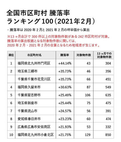 ■全国市区町村 騰落率ランキング100(2021年2月)