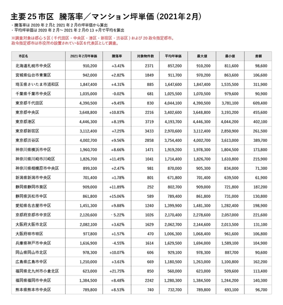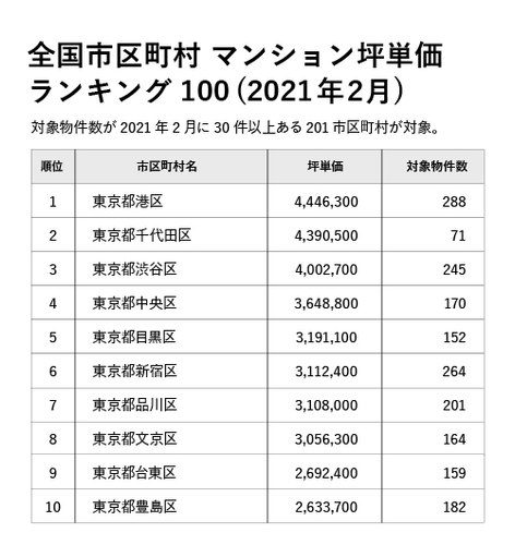 「マンションレビュー」2021年2月 全国市区町村 マンション坪単価・騰落率ランキング発表