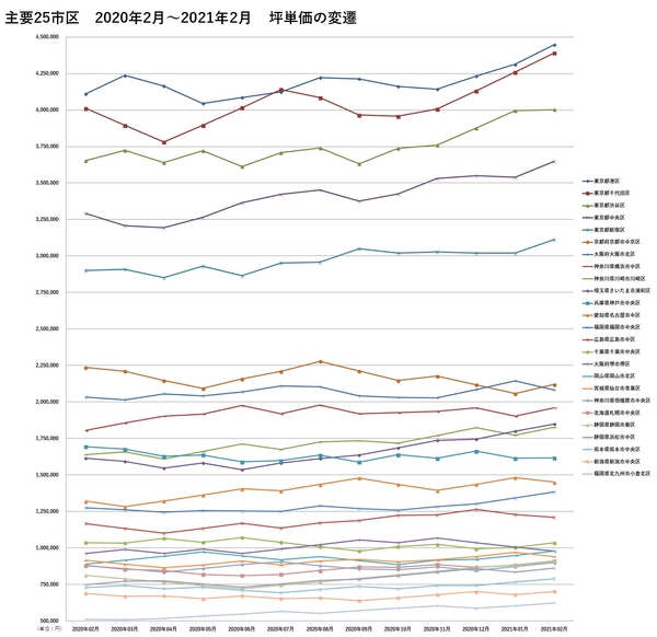 ―2020年2月~2021年2月の坪単価の変遷と騰落率を調査―