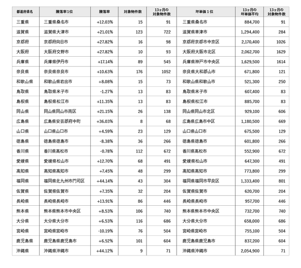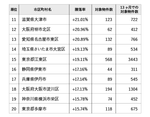 ・主要25市区での騰落率1位は「福岡県北九州市小倉北区」の+21.75%。
