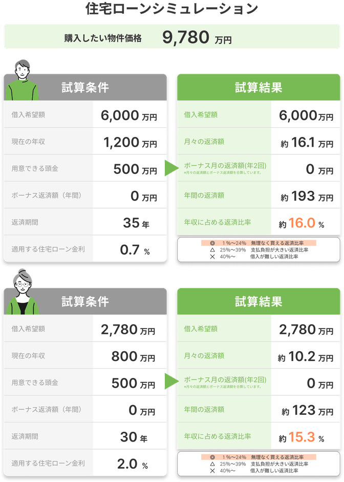 夫婦それぞれが住宅ローンを契約するため、合計の借入余力が大きくなります。返済比率の水準も抑えられ、約1億円のマンションが購入の選択肢となります。「憧れのエリア」や「資産価値の高い物件」に手が届くのは大きなメリットです。
