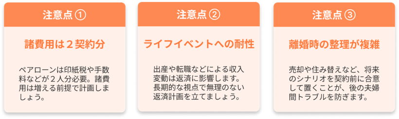 一方で、諸費用が2人分になる点や、出産・転職など将来の収入変動、離婚時の財産整理が複雑化するリスクもあります。メリットと注意点の両面を理解し、長期的な視点で夫婦で話し合い、計画的に活用することが成功のカギです。
