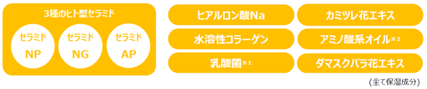 ※1 乳酸稈菌※2 ラウロイルグルタミン酸ジ(フィトステリル/オクチルドデシル) ※3加水分解ヒアルロン酸、ヒアルロン酸ヒドロキシプロピルトリモニウム、アルギン酸Na、オウゴン根エキス(全て被膜剤)
