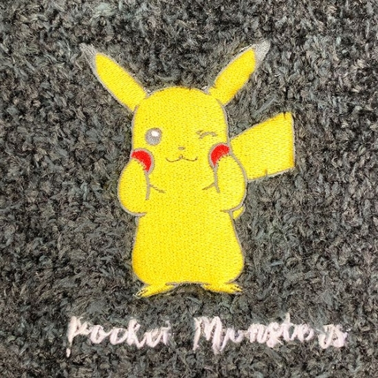 ブラックのもこもこ生地の巾着には、中央にピカチュウのアップリケがデザインされています。ブラックに黄色いピカチュウが映えますね~♪赤いリボンもアクセントになっていて、ラッピングのようです。