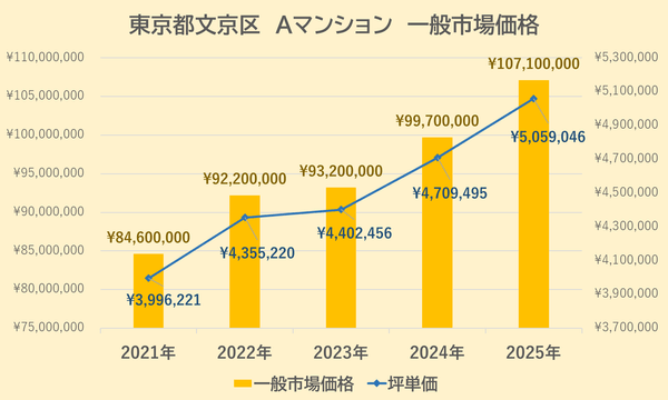 2021年は8,460万円(坪単価:約399万円(以下 @399万円))でしたが、翌2022年は9,220万円(@435万円)と上昇、2023年は9,320万円(@440万円)と微増、2024年は9,970万円(@470万円)、2025年は10,710万円(@505万円)と上昇していることがわかります。