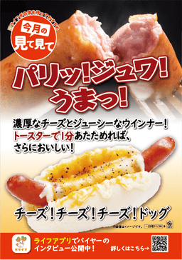 ライフが自信を持っておすすめする「今月の見て見て」の11月商品に選ばれた「チーズ!チーズ!チーズ!ドッグ」は、商品名からもわかるように、ゴーダ・ステッペン・チェダーの3種類のチーズを贅沢に使用したホットドッグです。サンドしているウインナーは天然腸を使用しておりパリッと食感を楽しめ、ジュワッとジューシーな味わいでこだわりのチーズともよく合います。
