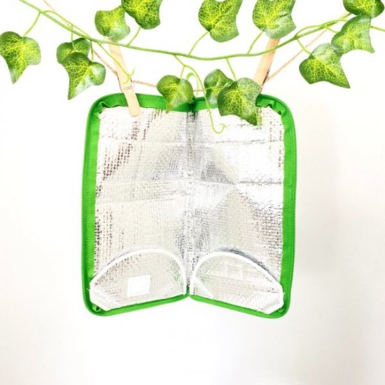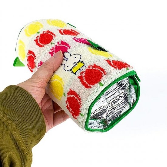 内側には保温保冷シートが付いているので温度をキープできるほか、底をつくればスタンドタイプにもポーチが早変わりします。