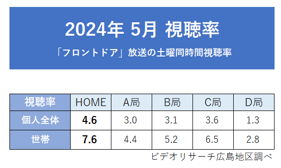 広島ホームテレビ(本社:広島市中区)で毎週土曜ごご1時から放送、ひろしま深掘りライブ「フロントドア」は、2024年5月の月間平均視聴率で個人全体・世帯いずれも同時間帯1位(ビデオリサーチ調べ、広島地区)を記録しました。