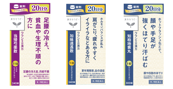 今回、女性特有の慢性症状に悩む女性をターゲットとして、「足腰の冷え、生理不順」を改善する 「当帰芍薬散」(とうきしゃくやくさん)、「ホルモンバランスの乱れからくる症状」を改善する「加味逍遙散」(かみしょうようさん)、「ホットフラッシュ」を改善する「知柏地黄丸」(ちばくじおうがん)の3処方の錠剤タイプを、20日分の大容量にして発売いたします。