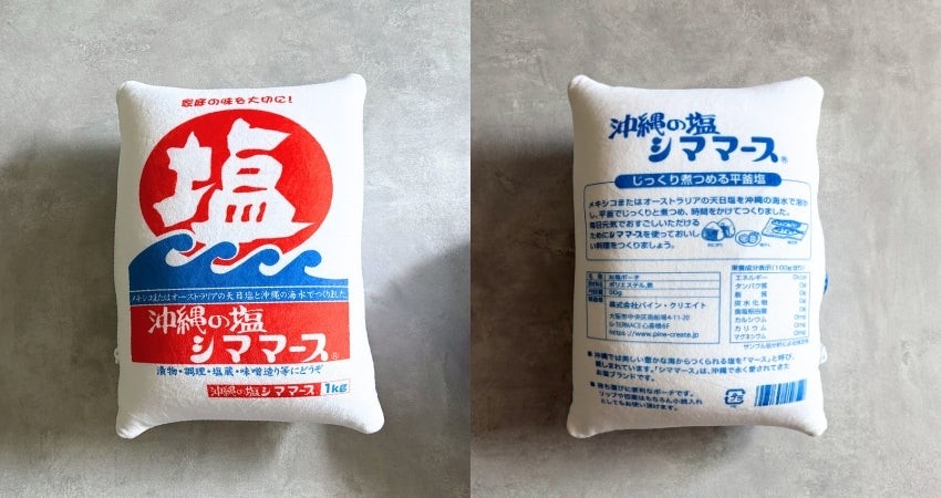 沖縄料理の定番塩として愛される【シママース】のパッケージがそのままクッションになったデザイン。背面の細かい説明まで再現されていて絶妙なサイズ感も相まって、パッと見、本物かな?と思ってしまうほど…