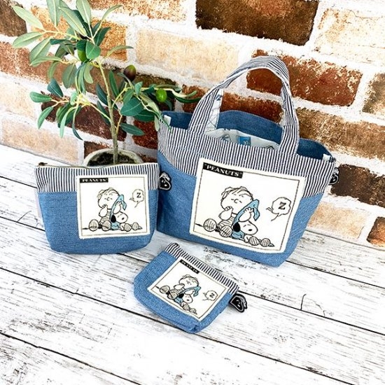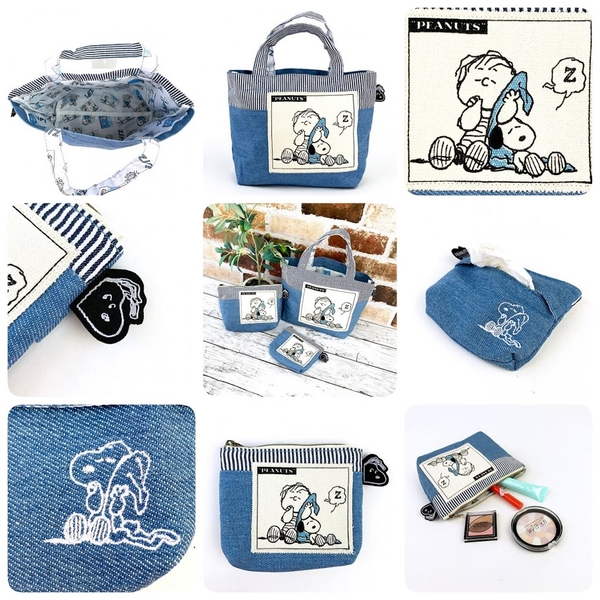 3点が並ぶと大きさが伝わりますでしょうか。タグがスヌーピー型になっていたり、内側までしっかりスヌーピーの生地を使っているなど細かいところまで気が利いていますよね。大人のスヌーピー好きさんにも納得いただけるのではないでしょうか?
