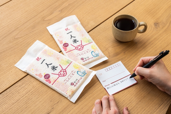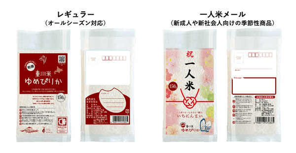「お米レター」は、1合分の東川米を真空パックにし、JAひがしかわが提唱する美味しい炊き方などの解説を記載したはがき風のデザインにしています。切手を貼ればそのまま郵送することも可能で、大切な人へ美味しいお米とともに想いを届けることができます。また、米づくりを通じて培ってきた文化や生産者が大切に育ててきた想いなどを基盤に、門出をお祝いするときに贈る「一人米メール」という発想を掲げたプロダクトも用意しています。