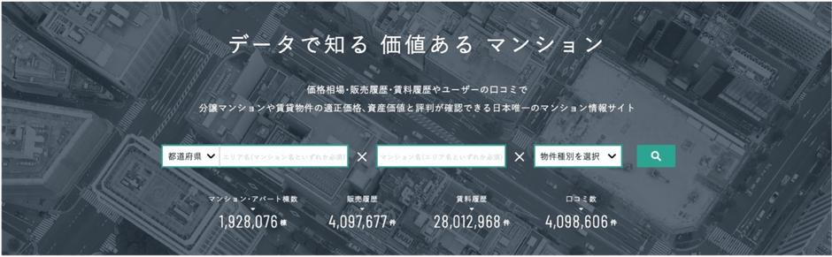 当社が2010年より運営のマンション情報を中心とした不動産情報サイト。全国約15万8千棟(2024年)の『物件概要・口コミ・適正相場・資産価値』がわかる情報サイトで、年間の訪問ユーザー数は約1,300万人(2024年)。登録会員数は2025年3月に82万人を突破いたしました。