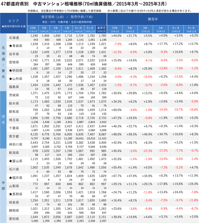 「不動産×WEB×ビッグデータ」の領域で、さまざまな不動産テックサービスを展開する株式会社ワンノブアカインド(本社:東京都港区、代表取締役社長:川島 直也、以下当社)は、当社が運営しているマンション情報サイト「マンションレビュー」の保有データを元に、全国の2025年3月の中古マンション相場を調査。坪単価をベースに70㎡での価格に換算した「中古マンション価格」*1について、10年前・5年前・3年前・前年からの推移を都道府県別・エリアごとにまとめましたので、発表いたします。