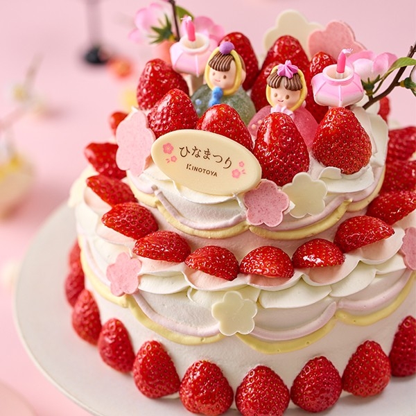 真っ赤ないちごやかわいらしいおひなさまをのせ、フレッシュな生クリーム、ふわふわのスポンジで仕上げた、特別なひなまつりケーキをご用意いたしました。すこやかな成長を願う、ひなまつり。大切な節目の日には心をこめたきのとやのケーキが花を添えます。