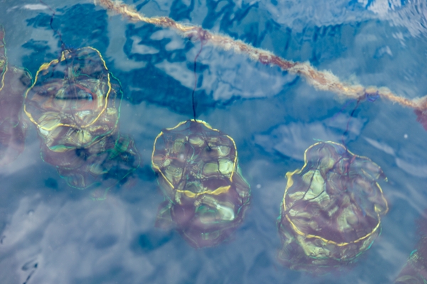 船に乗り、牡蠣を育てているロープを水面に引き上げ見せてもらうと、牡蠣のまわりには海藻、小魚や海老類も一緒に上がってきます。穏やかな水面からは想像つかないほど、豊富なプランクトンが湾に集まっていることが分かります。成澤さんは、牡蠣に栄養が行き渡るよう牡蠣から海藻類を取り除く作業をはじめ、牡蠣自体が大きくなり窮屈になる前に選別し手作業でネットに入れ替え、プランクトンが豊富な海水面に近い場所や、潮の流れの早い場所に移動し、さらに大きく育てます。