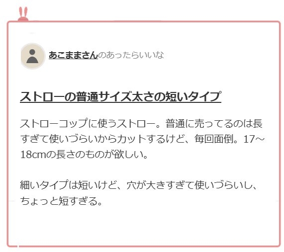 みん100に投稿された内容は、「ストローコップに使うストロー、普通に売っているのは長すぎて使いづらいからカットするけど、毎回面倒。17〜18cmの長さのものが欲しい」という具体的な要望。