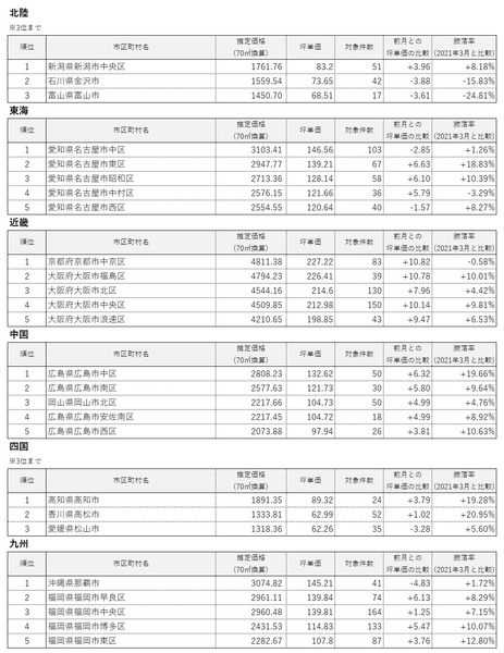 各エリア5位まで。ただし、「北陸」「四国」は対象件数が15件未満の市区町村が多いため3位までの掲載。