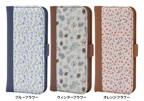 【iPhone13シリーズ】ブルー・ウィンター・オレンジのフラワーを散りばめた「花柄手帳型ケース」が発売!
