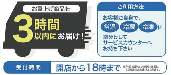 お客様が店舗でお買い物した商品を3時間以内にご自宅までお届けする「来店宅配サービス」を提供しております。