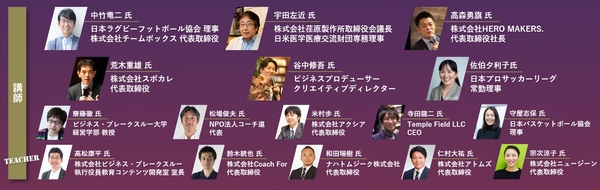 BBT大学 宇田左近副学長や、谷中修吾学科長など、一流の実務家教員を中心とした講師陣で構成されています。日本プロサッカーリーグ常勤理事の佐伯夕利子氏や日本バスケットボール協会理事の守屋志保氏など、アスリート界の指導者も講師陣として名を連ねています。