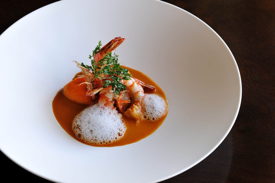 八重山で冬の味「車エビ」を余すことなく使用したビスクを提供します。車エビの旨味が凝縮された濃厚なビスクと甘みの強い島人参のピューレを合わせ、相性を楽しむ一品です。美しい八重山の水や気候で育った車エビはストレスを感じない環境で育ち、ぷりぷりとした食感や甘みを感じます。エスプーマに仕立てた発酵食材の「豆腐ヨウ」がほのかに香る濃厚なスープです。