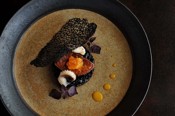 八重山の冬に旬を迎えるクブシミ、コウイカを大胆にフォアグラに合わせた料理です。フレンチの王道でもあるフォワグラを、お米を発酵して作った「やいま味噌」でマリネすることで濃厚な味わいに深い味噌の香りをまとわせました。相性のよいフォアグラとイカスミのリゾットの濃厚さに、甘酸っぱいたんかんのソースがアクセントです。