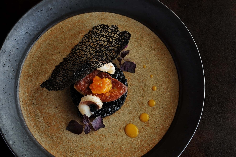 フォアグラとクブシミのポワレ イカ墨のリゾットと共に
