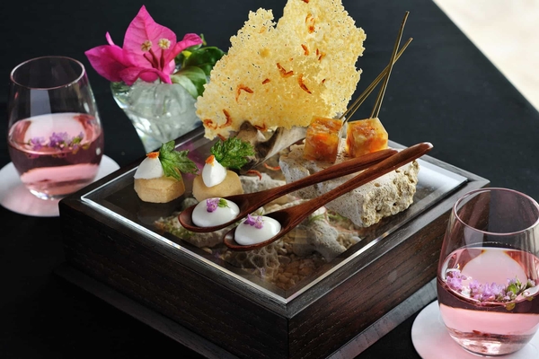 ディナーコースの始まりは、風の心地よいテラスでのアペロです。食前酒に用意するのは、命草のひとつであるシーショ(赤紫蘇)と、竹富島で祭事や行事の際に口にする泡盛と塩を組み合わせたオリジナルのカクテルです。カクテルと一緒に、ヤギのチーズと合わせて味わう「泡盛酒粕」を練りこんだちんすこうなど、2種のアペリティフを提供します。風で草木がそよぐ音や虫の鳴き声、夕焼けから星空に移りゆく空の景色など、竹富島の自然を体感しながら、その後に続くディナーコースへの期待感が高まります。