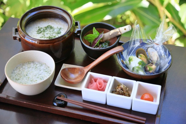 冬が旬の命草と油みそを合わせた、お粥冬限定の和朝食です。命草と油みそをすり合わせ、お粥と一緒に楽しみます。畑人とは畑を耕す人のことで、島の方は栄養たっぷりの朝食を食べ、朝から元気に活動していました。島の習慣にならったボリュームたっぷりの朝食を用意します。
