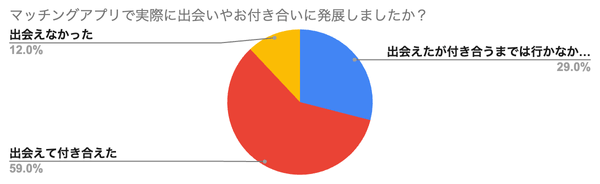 実際に出会い・交際については、6割近くが交際まで発展しており「出会えて付き合えた」が59.0%、「出会えたが付き合うまでは行かなかった」が29.0%という結果でした。