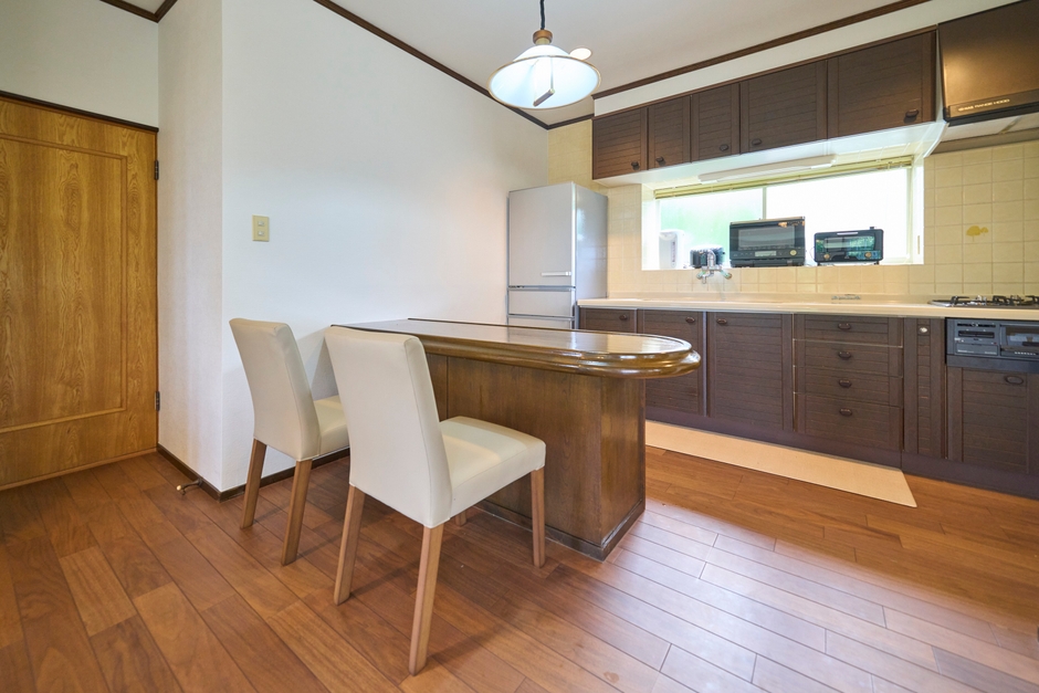 2階建ての3LDKの全面リフォームが施された室内は、白を基調にした内装の洗練されたデザインで清潔感が漂います。寝室は1階に2室の洋室(シングル×2、ダブル×2)、2階に和室(布団×3)があり、最大9名様までご利用いただけます。広々としたリビング・ダイニングスペースには、白い電子ピアノ、ソファ、ダイニングテーブルを備えており、円形状におしゃれに取り付けられた複数の窓が、ご家族・ご友人との団欒のひと時を楽しく演出します。また、屋外に設置されたテラススペースでは伊豆高原の自然を感じながらゆったりとお過ごしいただけます。さらに、バーベキュー設備を完備しており、アウトドア気分でのお食事を楽しむことが可能です。