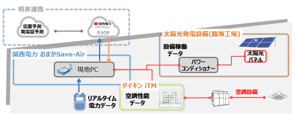 具体的には、当社堺製作所臨海工場に、関西電力の太陽光発電設備を設置し、当社の集中管理コントローラー「インテリジェントタッチマネージャー」※1(以下、iTM)と、関西電力の空調制御サービス「おまかSave-Air」※2を活用しながら工場内の電力需給を管理します。太陽光発電の出力変動に応じて、使用電力比率の高い空調機を最適制御する技術の確立を目指すものです。快適な職場環境や設備の安定稼働を維持しながら、契約電力※3削減を見据えた取り組みです。