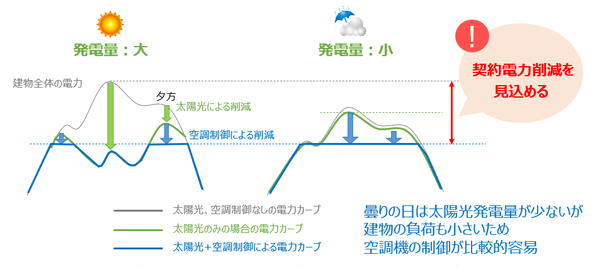 太陽光発電を導入した施設では、発電量が少なくなる天候時に、最大電力が発生する傾向があります。このような時間帯に発電量に応じて空調機を最適制御することで、電力の需給調整を実施します。
