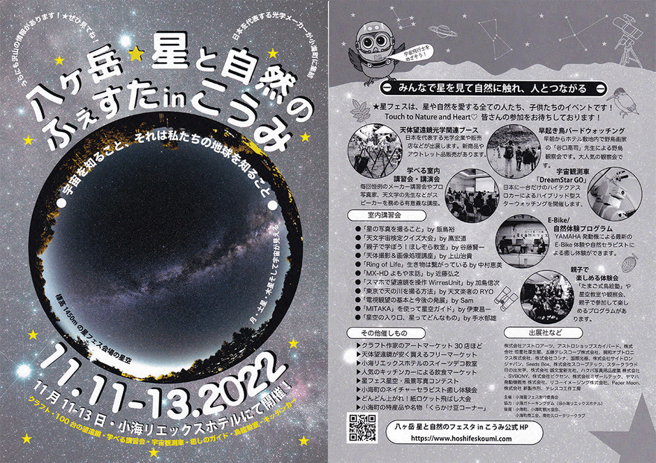 11月11日(金)~13日(日)に開催される「八ヶ岳 星と自然のふぇすたinこうみ」に出店。製品展示や講習会・星空観察会を行います。