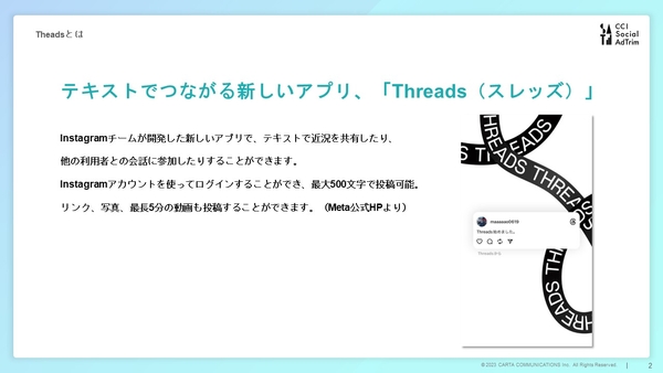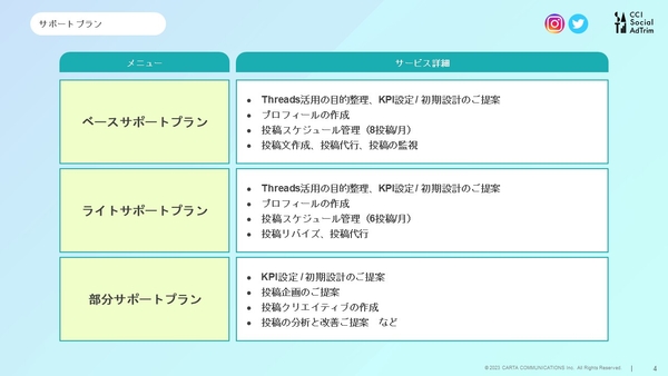 株式会社CARTA HOLDINGSのグループ会社である株式会社CARTA COMMUNICATIONS(東京都中央区、代表取締役社長:目黒 拓、以下「CCI」)は、企業におけるSNS マーケティングの課題解決を提供するコンサルティングサービス「CCI Social AdTrim」において、企業のThreadsビジネスアカウントの開設から運用までをワンストップで提供・支援する、Threads アカウント運用サポートサービスの提供を開始いたしました。