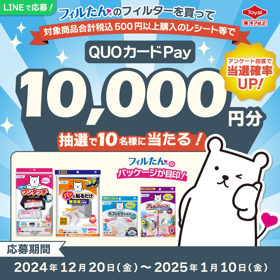 東洋アルミエコープロダクツ株式会社(本社:大阪府大阪市、代表取締役社長:山口正起)は、10,000円分のQUOカードPayが抽選で当たるキャンペーンを2024年12月20日~2025年1月10日まで開催中です。空気の通り道に取付けて汚れを防止するフィルたんのフィルターシリーズの商品はホコリや空気の汚れをキャッチし、次のお掃除をラクにしてくれます。