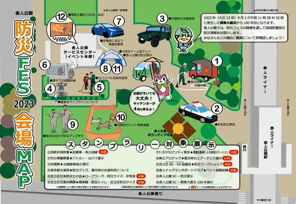 1923年(大正12年)9月1日午前11時58分32秒に発生した関東大震災から100年目となります。舎人公園では、防災フェスの開催を通して地域密着型の防災情報をお届けします。みなさんもこの機会に防災について再確認しましょう。