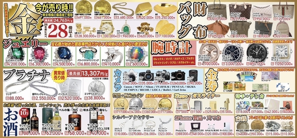 今回のキャンペーン対象外となる商品でも、裏面チラシに記載の通り、金・プラチナ・ジュエリー・ブランド品・時計・お酒・スマートフォンなど、豊富なジャンルで高価買取を実施中です!