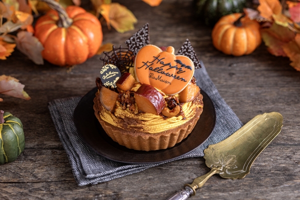 かぼちゃケークタルトに北海道産のかぼちゃクリームとキャラメルクッキークリームを重ね、しっとりとなめらかな食感で上品な甘みとオレンジ色の果肉が特徴のハロウィンスイートを飾りました。