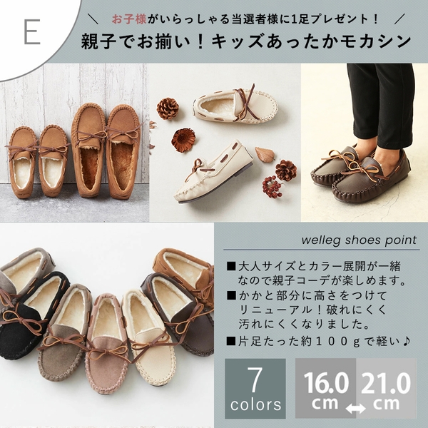 親子でおそろいコーデが楽しめる、16㎝~21㎝のファーモカシン。当選者さまにお子様がいらっしゃった場合に1足のみプレゼントさせていただきます。