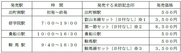 また、叡山電車の出町柳駅、修学院駅、貴船口駅、鞍馬駅の4駅にて乗車記念として同企画の限定台紙を使用したご朱印風「来訪記念印」(枚数限定)を発売します。