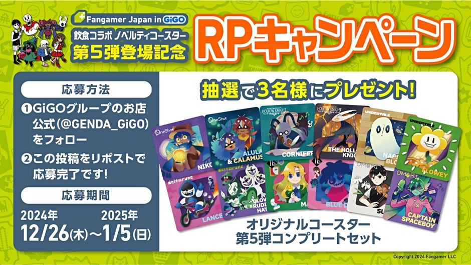 Xアカウント(https://x.com/GENDA_GiGO)をフォローの上で、該当の投稿をリポストされたお客さまの中から抽選で3名さまに「オリジナルコースター第5弾コンプリートセット(全12種)」をプレゼントいたします。