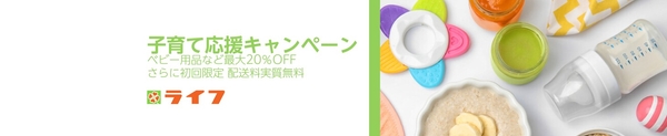 さらに、Amazon上のライフネットスーパーのサービス提供全エリアにおいて、これから赤ちゃんを迎えるご家庭や子育て中のご家族を応援できるよう、Amazonファミリー(www.amazon.co.jp/family)もしくはAmazonベビーレジストリ(www.amazon.co.jp/baby-reg)にご登録いただいているお客様を対象に、「Amazonファミリー・ベビーレジストリ登録者限定 ライフ子育て応援キャンペーン」を3月26日(土)まで開催いたします。