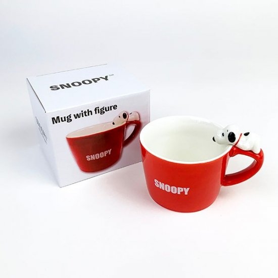 真っ赤なカラーのマグカップにSNOOPYのロゴが入ったシンプルなデザインです。そこにかわいさをプラスしてくれているのが、持ち手の上部に乗っかったスヌーピーのフィギュア♡