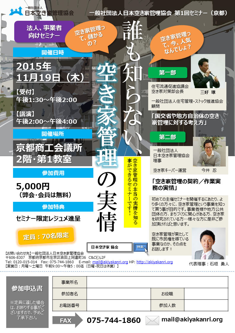 2015年10月29日 10:00一般社団法人日本空き家管理協会(所在地:京都府京都市左京区、代表理事:石垣 勇人)が、空き家管理事業の周知拡大を目的とした、空き家管理に関わるセミナーを京都商工会議所(京都府京都市)にて、2015年11月に「当会主催の法人向け」「京都市主催の一般向け」の2種類開催します。
